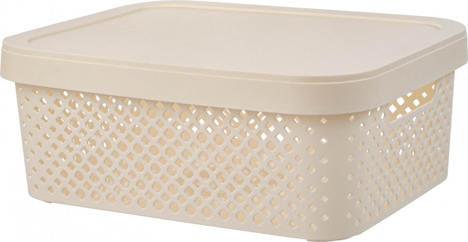 Корзина имеет удобные для переноски ручки-вырезы по бокам корпуса. Крышка на корпусе сохранит визуальный порядок, скрывая и защищая содержимое сверху.